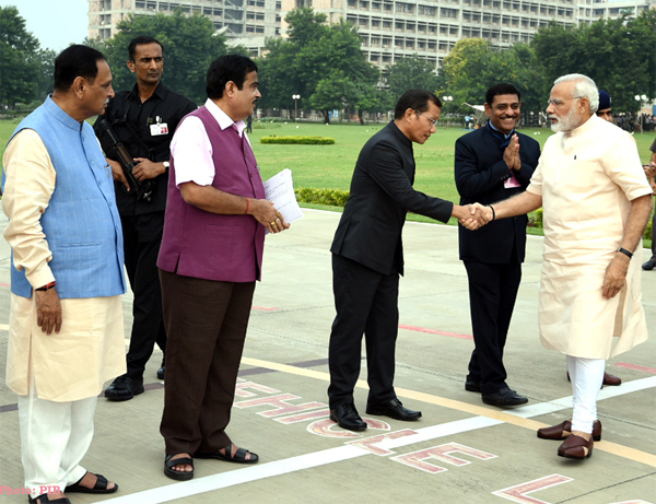 Gujarat on September 17, 2017: The Prime Minister, Narendra Modi embarks his journey from Gandhinagar to Kevadia where he will dedicate Sardar Sarovar Dam to the nation, Gujarat. The Union Minister for Road Transport & Highways, Shipping and Water Resources, River Development & Ganga Rejuvenation, Shri Nitin Gadkari and the Chief Minister of Gujarat, Shri Vijay Rupani are also seen.