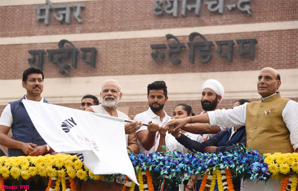 New Delhi on October 31, 2017: The Prime Minister, Narendra Modi flagging off the Run For Unity, on the Rashtriya Ekta Diwas, at Major Dhyan Chand National Stadium, in New Delhi. The Union Home Minister, Shri Rajnath Singh, the Minister of State for Youth Affairs and Sports (I/C) and Information & Broadcasting, Col. Rajyavardhan Singh Rathore and other dignitaries are also seen.
